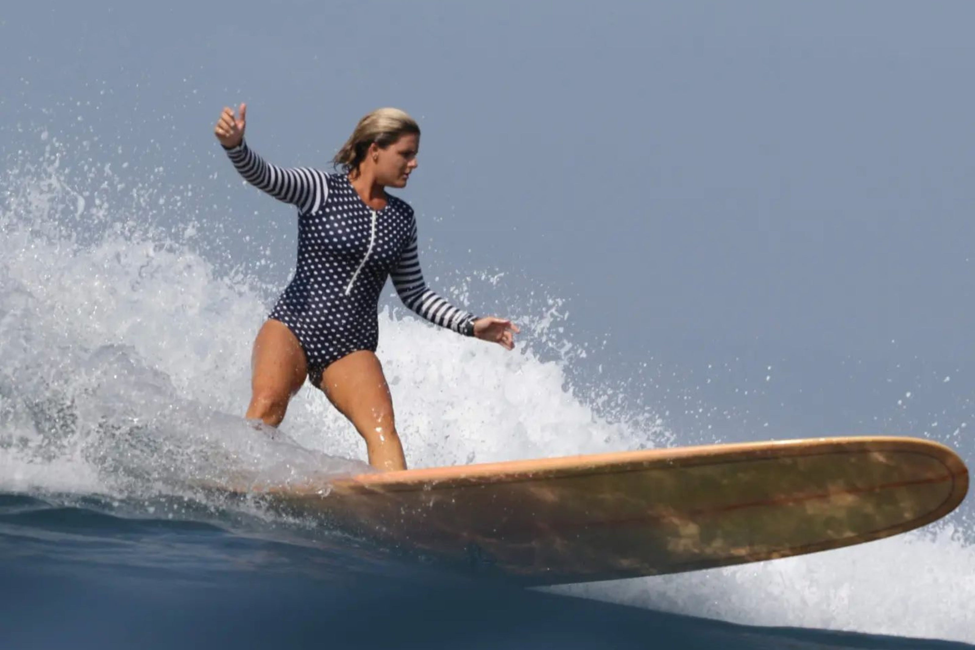 She brings a joyful and supportive energy to the lineup, helping women feel more confident and connected in their surfing.